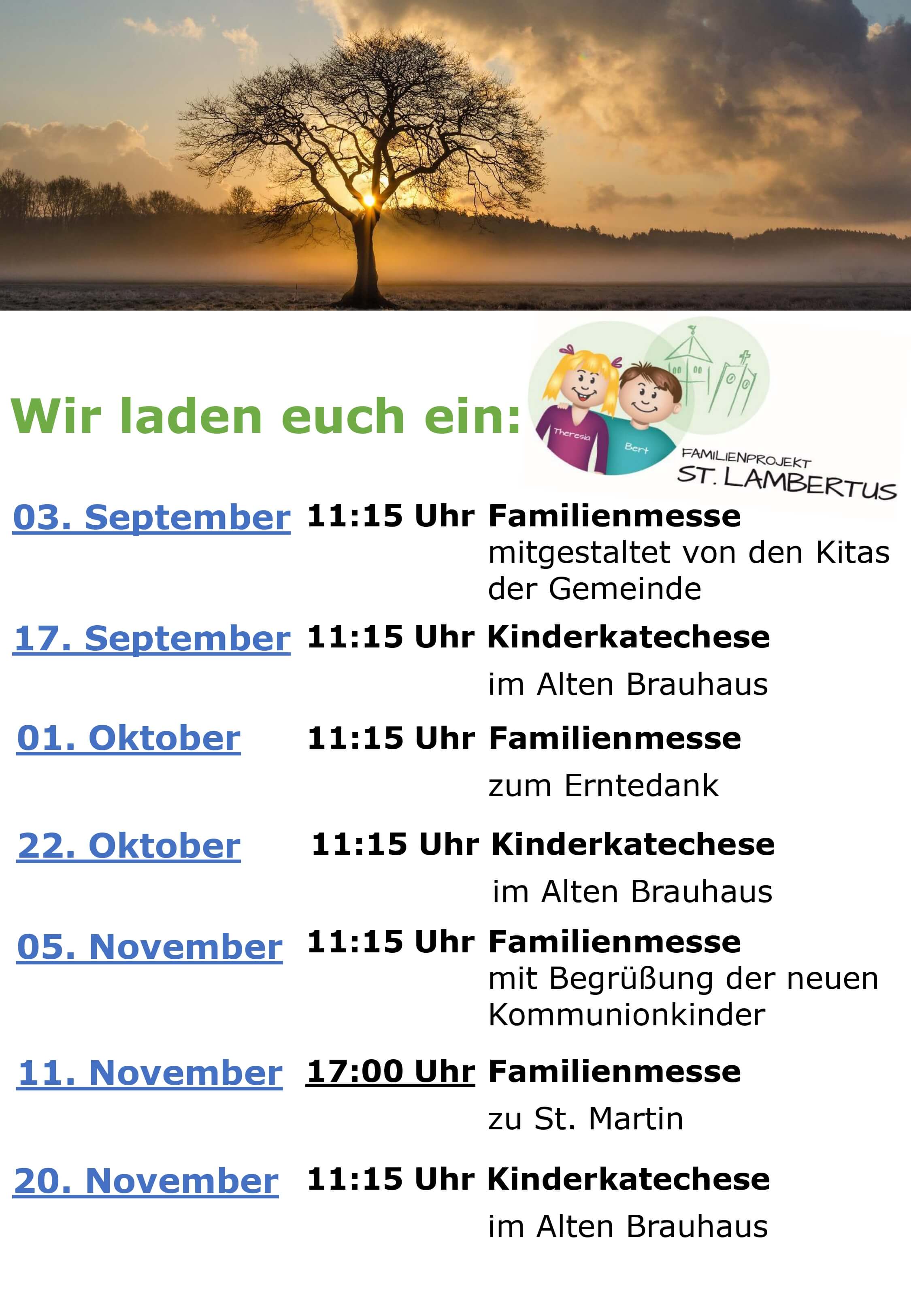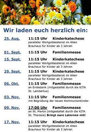 nach den Sommerferien finden wieder Familienmessen und Kinderkatechesen statt. Eine Übersicht über die Gottesdienste findet ihr hier: