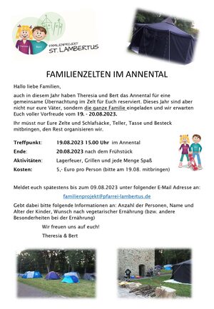 vom 19. auf den 20. August seid ihr herzlich eingeladen mit uns eure Zelte an der Annenkapelle aufzuschlagen. Neben Spiel und Spaß erwartet euch am Abend eine Lagerfeuerrunde. Anmelden könnt ihr euch bis zum 09. August unter familienprojekt@pfarrei-lambertus.de