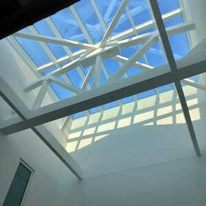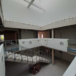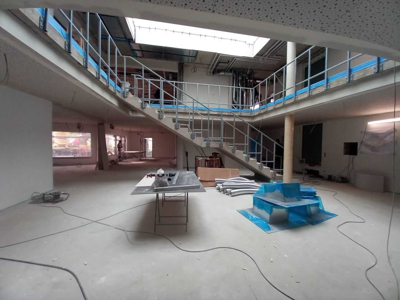 Nach Installation der Fenster ist die Gebäudehülle jetzt geschlossen, so dass der Innenausbau starten konnte. Derzeit arbeiten parallel verschiedene Firmen zum Beispiel aus den Bereichen Elektro, Sanitär, Innenputz und Trockenbau mit teilweise mehr als 30 Personen auf der Baustelle. Inzwischen wurde auch das neue Dachfenster in die Dachfläche eingesetzt. Zukünftig wird über dieses Dachfenster Tageslicht in das ganze Gebäude scheinen, bis ins Atrium der Kita.