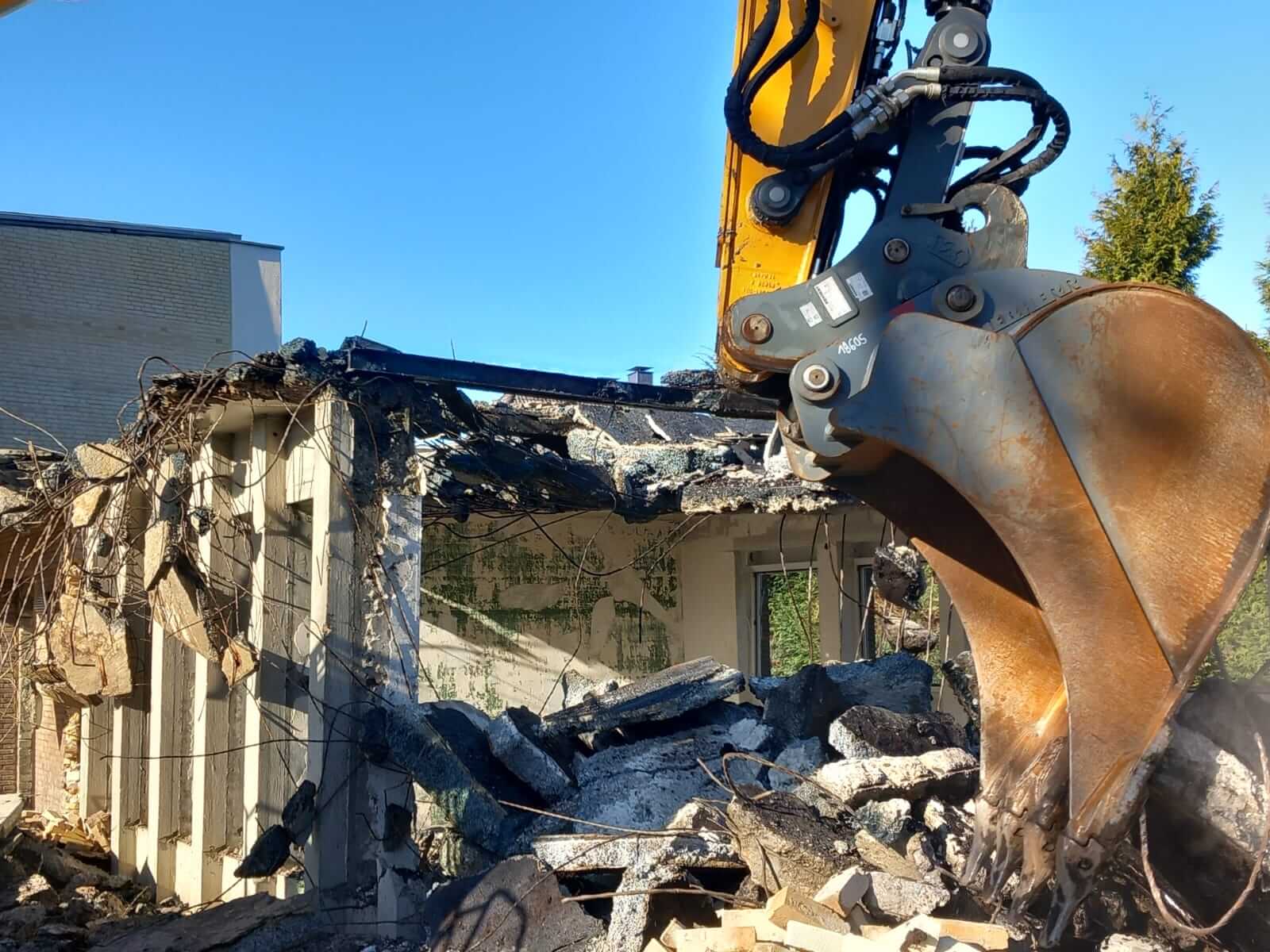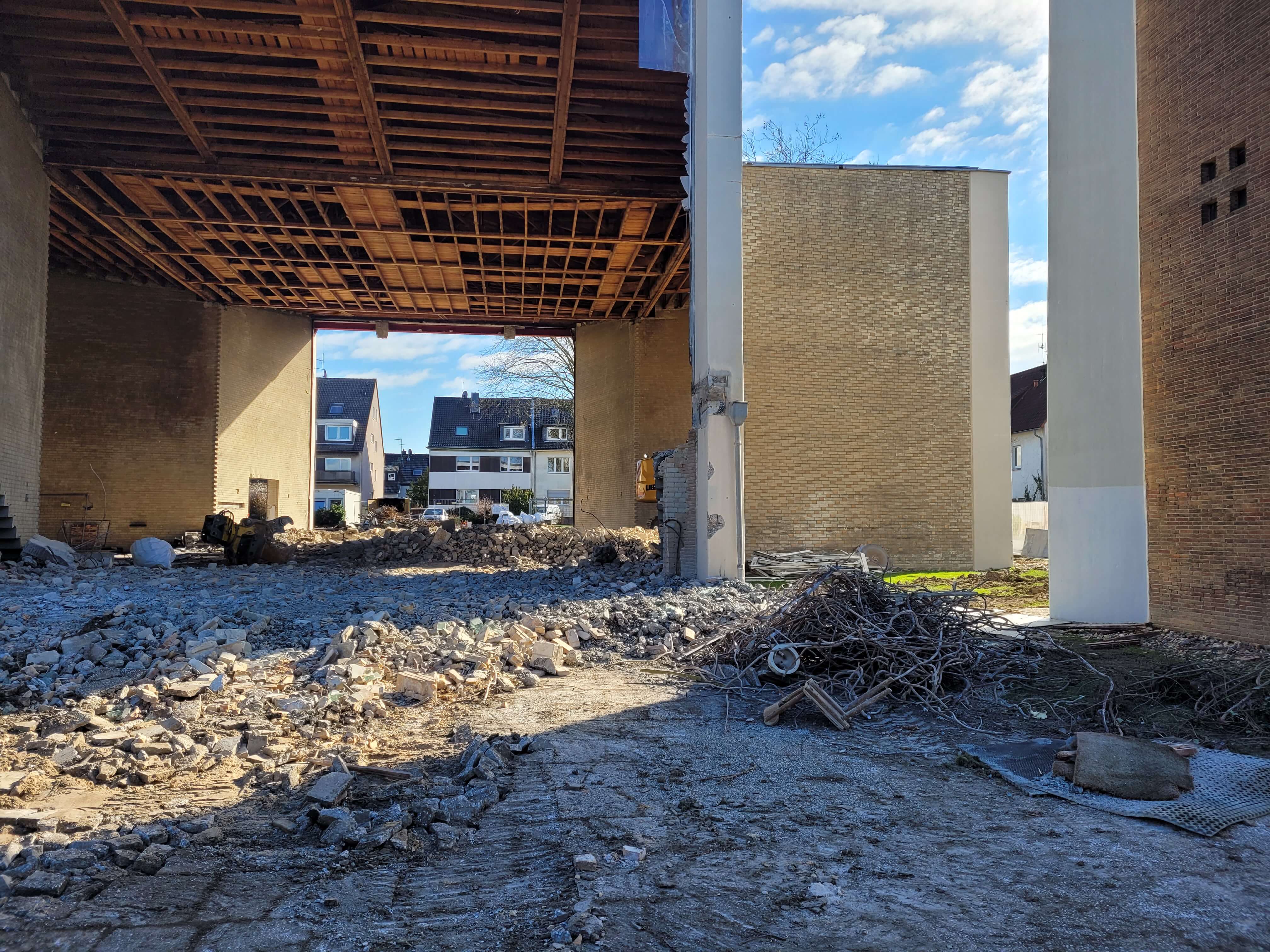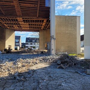 Das Mauerwerk zwischen den Betonstützen wurde inzwischen weitestgehend entfernt. Aktuell wird das abgebrochene Material weggefahren.