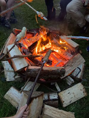 Am letzten Wochenende haben insgesamt 11 Familien ihr Zelt an der Annenkapelle aufgeschlagen. Nachdem alle einen Platz gefunden hatten wurde sich die Zeit beim Kubb-, Fußball, oder Federballspielen vertrieben oder das Rätsel zur Kapelle gelöst. Die kleine (aber heftige) Regenschauer zwischendurch konnte die guten Stimmung nicht trüben. Nachdem sich alle mit Bratwurst vom Grill gestärkt haben, wurde dieser zum Lagerfeuer umfunktioniert. Natürlich durfte eine Runde Stockbrot nicht fehlen, wobei es eher die Eltern waren, die das Brot am Ende über dem Feuer fertig rösten mussten.