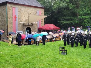 Trotz des Dauerregens versammelten sich am 23. Juli wieder viele Mitglieder der Gemeinde, der Pfadfinder, der eucharistischen Ehrengarden und Bannerabordnungen einiger Kolpingsfamilien zum Festgottesdienst an der Annenkapelle und zur anschließenden Prozession zur Stiftskirche. Dank des morgens von den Pfadfindern noch aufgebauten Zeltes bot sich für alle hinterher noch die Möglichkeit zum Mittagessen und zum Kaffeetrinken im und am Brauhaus zu verweilen.