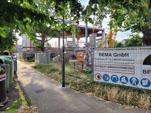Nachdem in den ersten Wochen des Rohbaus wenig zu sehen war, geht es jetzt sichtbar mit den Mauerarbeiten voran. Inzwischen wurde die erste Geschossdecke betoniert. Die Räume des Erdgeschosses, die eine Etage der Kita aufnehmen, sind in Grundzügen bereits erkennbar.
