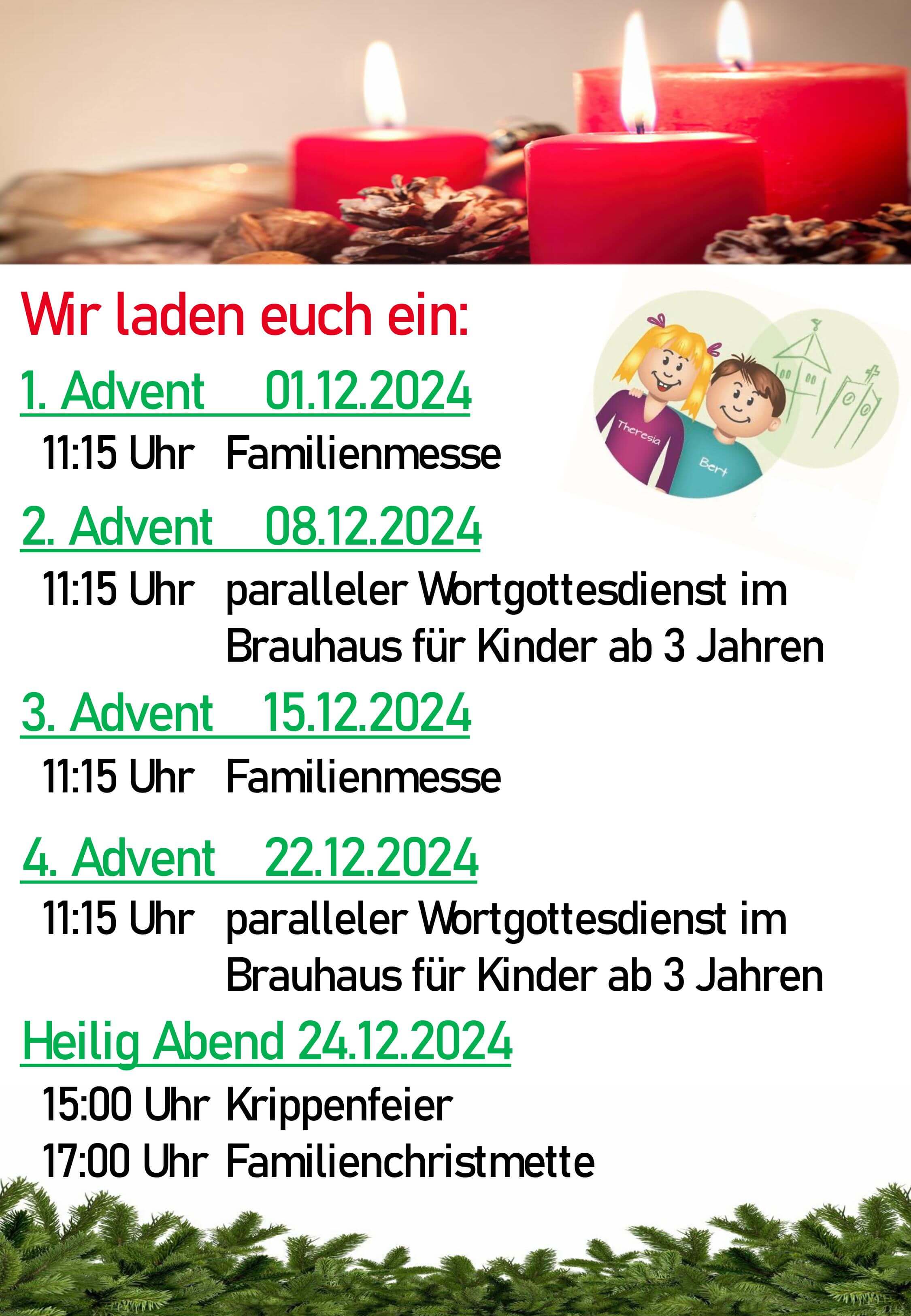Auch in diesem Jahr laden wir an jedem Adventssonntag zu einer Familienmesse bzw. zu einer Kinderkatechese ein (getrennt nach Schul- und Kindergartenkinder).
