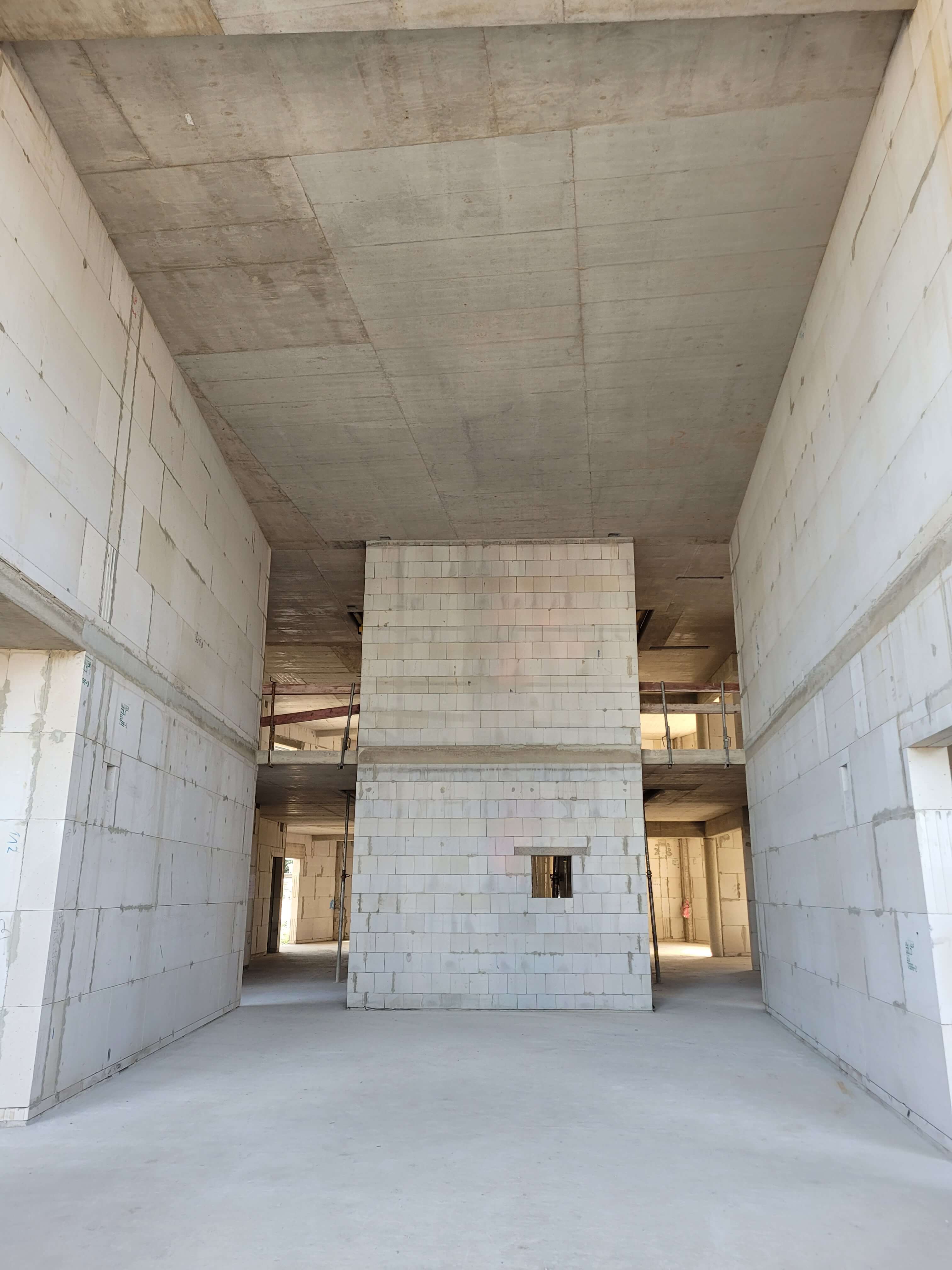 Die Form der neuen Kapelle, die sich in der Höhe über zwei Etagen erstreckt, ist jetzt gut zu erkennen. Auch so bietet der aktuelle Bauzustand vor Beginn des Innenausbaus einige interessante Blickwinkel – so den Blick durch den noch leeren Aufzugschacht bis unter das Dach.