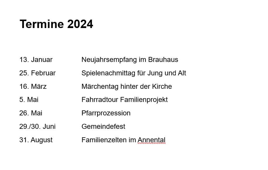 Am 23. November hat der Gemeinderat den Termin für den Neujahrsempfang und das Gemeindefest 2024 festgelegt. Wir laden alle Gemeindemitglieder am 13. Januar nach der Vorabendmesse zum Neujahrsempfang in Brauhaus. Am Wochenende 29./30. Juni feiern wir unser Gemeindefest rund um die Kirche St. Lambertus.