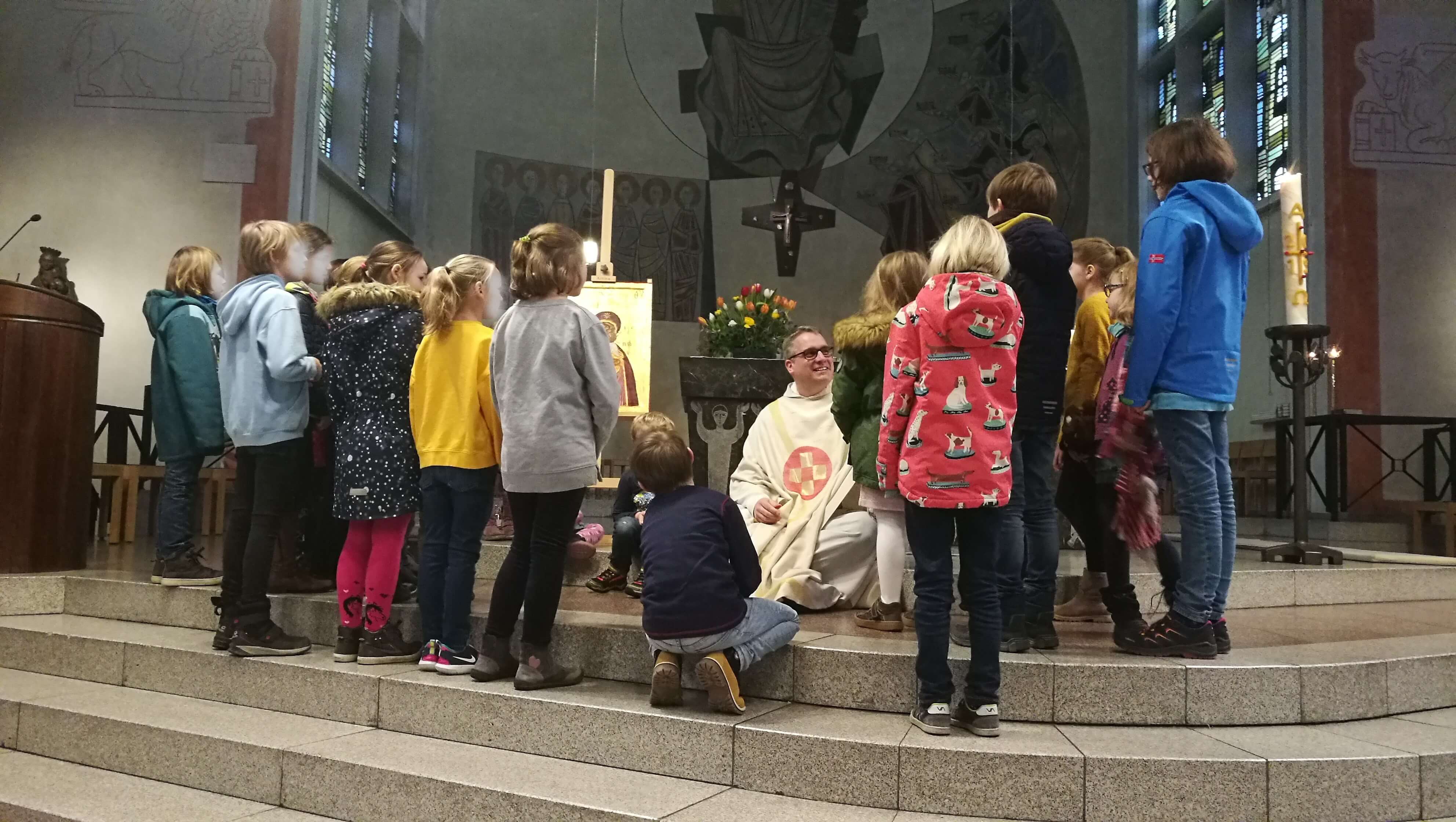 Am vergangenen Sonntag, 2.2.2020, wurde die neue Marien-Ikone in St. Ludgerus und Martin geweiht. Vorher hatten die Kinder unserer Gemeinde die Gelegenheit sich die Ikone aus der Nähe anzusehen. Die Erwachsenen nahmen das ausgelegte Infoblatt zur Hand, um den Ausführungen zu folgen. Pastor Scherges, der die Ikone geschrieben hat, nahm sich die Zeit zu erklären, was auf der Ikone steht, welche Zeichen es gibt, was diese bedeuten und wie eine Ikone geschrieben wird.