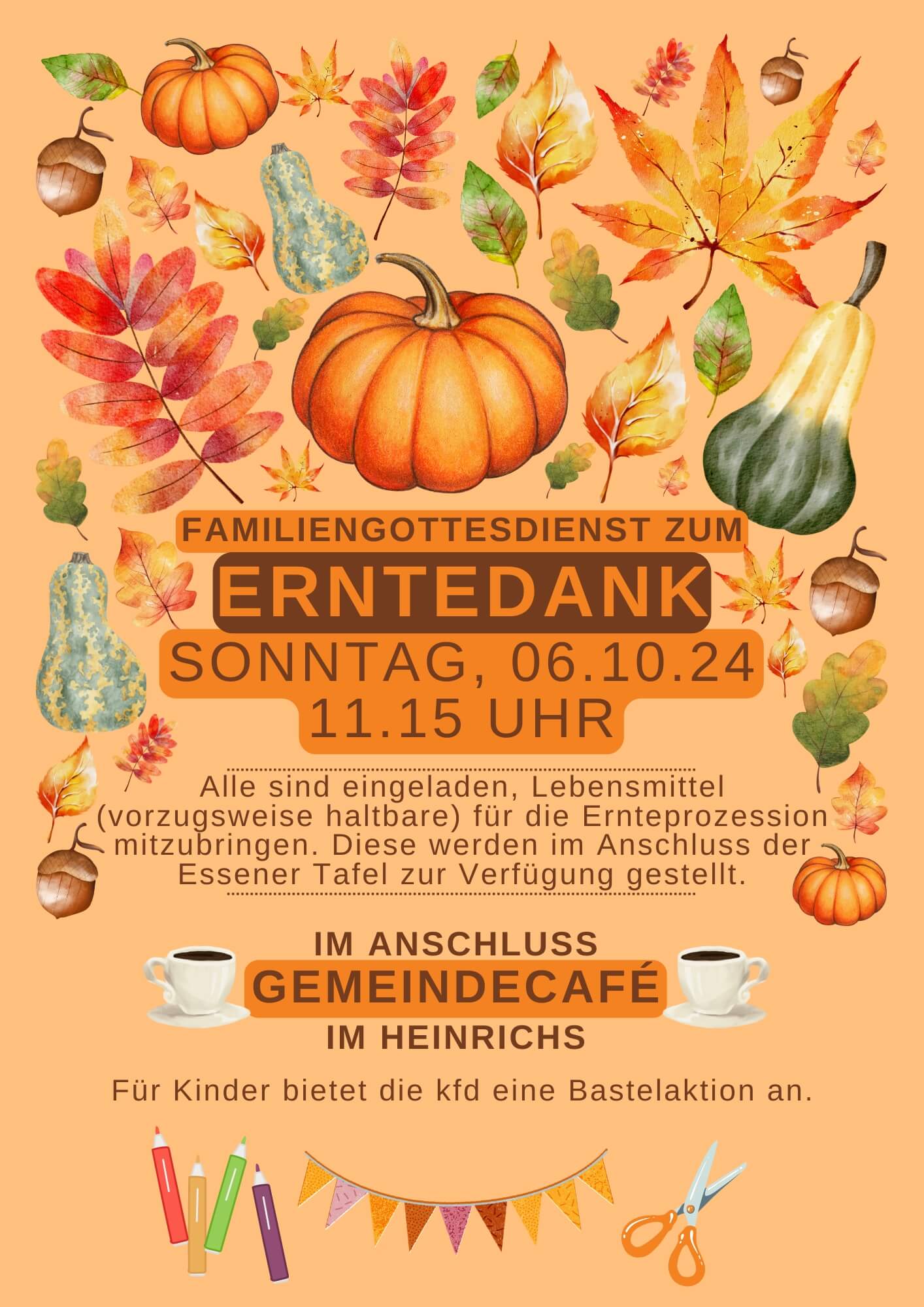 Alle sind eingeladen, Lebensmittel (vorzugsweise haltbare) für die Ernteprozession mitzubringen.