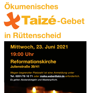 Am Mittwoch, 23.6.2021 um 19.00 Uhr laden wir herzlich ein zum Ökumenischen Taizé-Gebet der evangelischen und katholischen Kirchengemeinden.