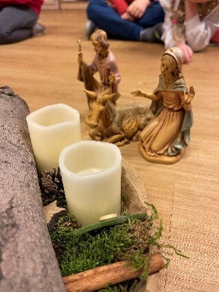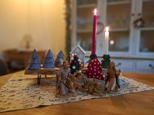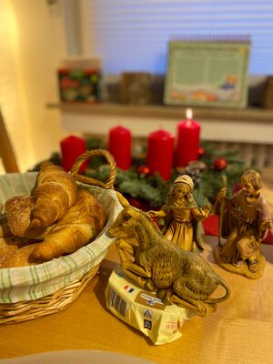 Die Weiterreise im Kinderwagen und mit dem Fahrrad war etwas holprig. Auf dem Weg zur Unterkunft bei der neuen Gastfamilie sind wir noch bei deren Großeltern eingekehrt und haben uns bei Plätzchen, Kerzenschein und Weihnachtsliedern gestärkt. Nach einem verspäteten Mittagsschlaf und leckerem Abendessen ging es dann weiter. In der neuen Herberge haben wir ein warmes Bett neben einem leuchtenden Stern auf der Fensterbank bekommen und durften einer Adventskalendergeschichte von "Schnüpperle" und seiner Schwester Annerose als gute Nacht Geschichte lauschen. Wir haben sehr gut geschlafen, auch wenn Josef ein bisschen geschnarcht hat. Heute morgen wurde Maria noch ärztlich untersucht, weil ihr der Rücken vom großen Babybauch ein bisschen weh tat. Dem Baby geht es zum Glück sehr gut und es wird wahrscheinlich in knapp zwei Wochen - um Weihnachten herum - zur Welt kommen, hat die Ärztin vermutet. Nach einem gemeinsamen Frühstück mit Müsli und Kaffee sind wir dann (mit ein bisschen Wegproviant - etwas von den leckeren Plätzchen von gestern) weitergezogen und schon sehr gespannt, was uns heute erwartet.