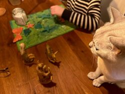 Da war der Morgenkreis auch schon im vollen Gange. Ein Kind, ich glaub es heißt Levi, hat uns von seinen Äpfeln probieren lassen. Froh über dieses Frühstück waren wir doch sehr erschrocken, als plötzliche ein ganzes Kartenspiel auf uns regnete. Fast hätten wir einen Unfall gehabt und wären vom Tisch gefallen. Zum Glück kamen Helfer auf 4 Pfoten- Zuma und Chase- und nette Kinder die uns beschützt und schnell wieder Ordnung gemacht haben. Ein wenig haben wir noch beim Malen und Basteln zugeschaut, dann haben uns Thea, Tilda und James in die Dachsgruppe gebracht. Die Dachskinder kamen gerade von einem Ausflug zurück. Sie haben 2 große Weihnachtsbäume gesehen und für uns gesungen. Die Kinder versprechen, dass sie uns gleich mit zum Essen nehmen, denn alle, auch wir, sind sehr hungrig.