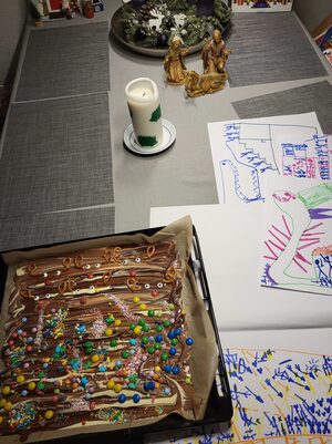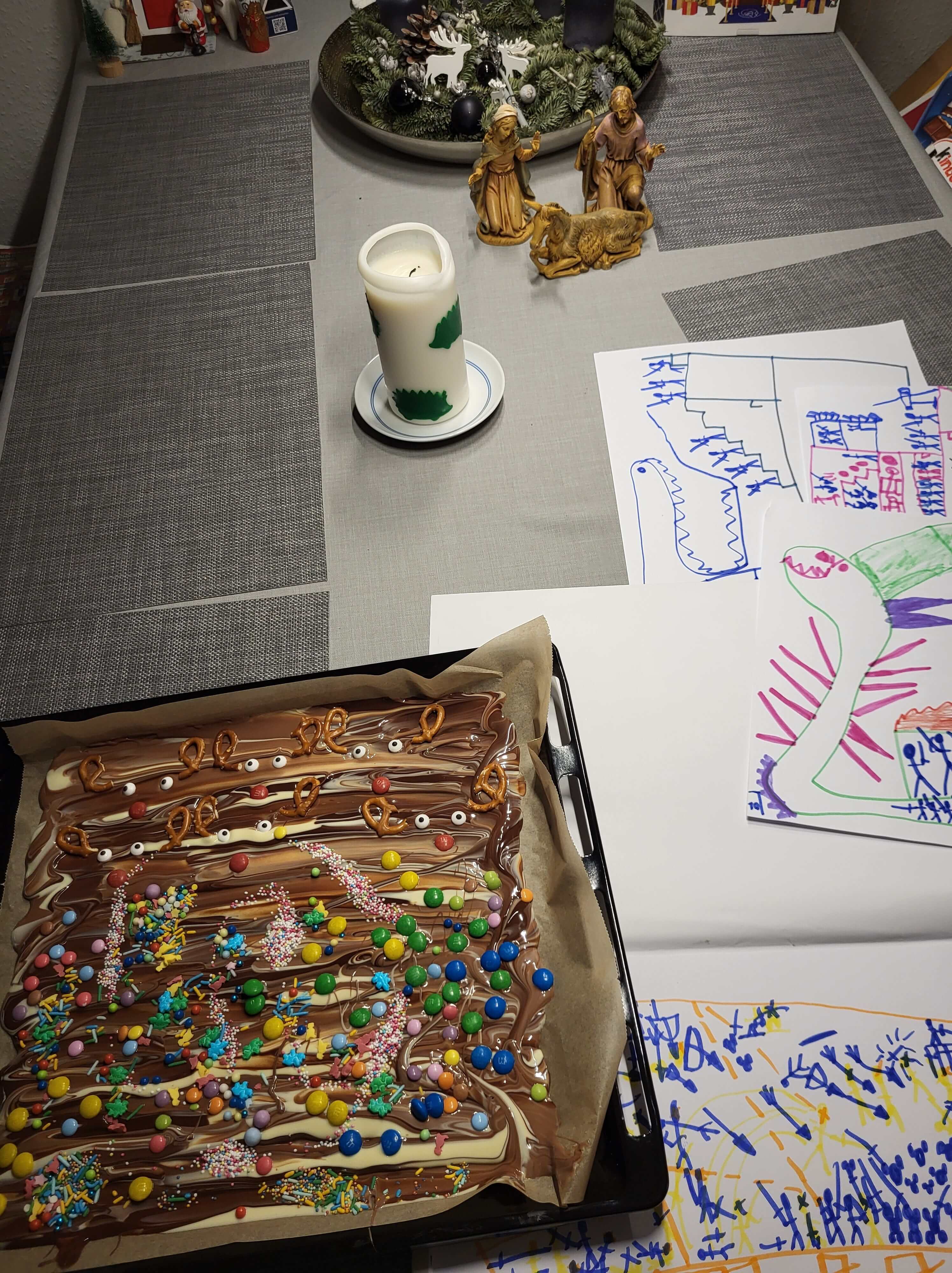 Im Backofen schmilzt derzeit schon ein Blech voll Schokolade. Die verzieren wir mit Schokolinsen, bunten Perlen, Brezeln und kleinen Zuckerdinos. Daraus soll Bruchschokolade werden. Die können wir an Menschen verschenken, die im letzten Jahr nett zu uns waren. Während die Schokolade abkühlt, malen wir noch ein bisschen.