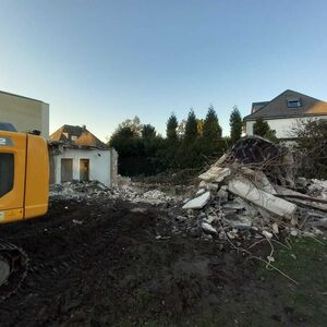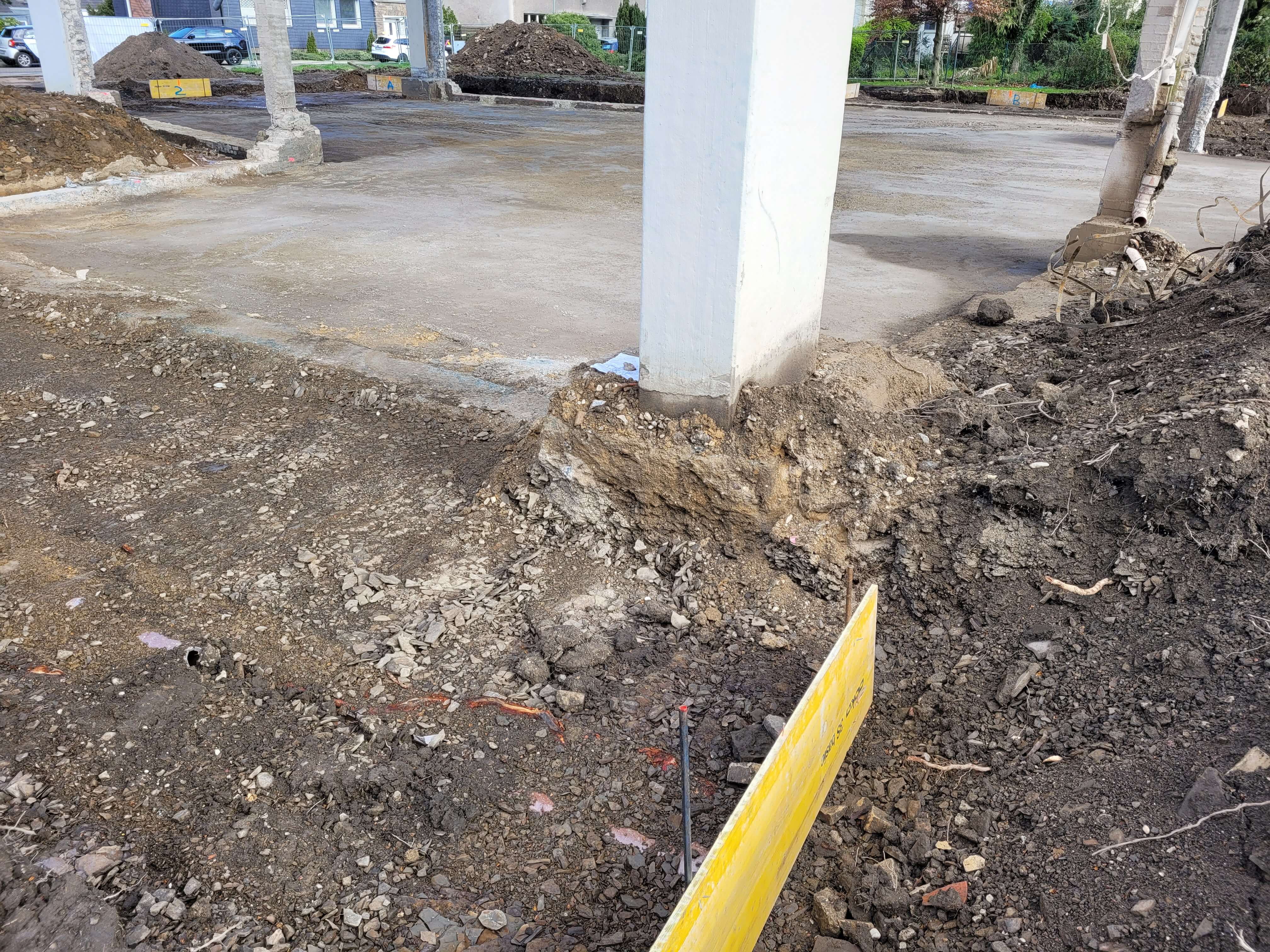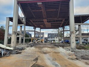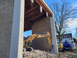 Das Mauerwerk zwischen den Betonstützen wurde inzwischen weitestgehend entfernt. Aktuell wird das abgebrochene Material weggefahren.