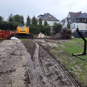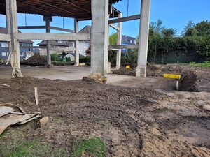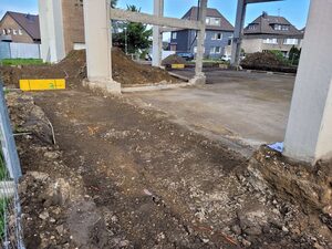 Nach Abschluss der Abbrucharbeiten bot das bisherige Kirchengebäude ein trauriges Bild. Nach Ostern hat jetzt der Wiederaufbau gestartet. Zunächst werden Fundament- und Entwässerungsarbeiten ausgeführt. Wahrscheinlich gegen Ende Mai werden die ersten neuen Mauern zu sehen sein.