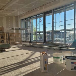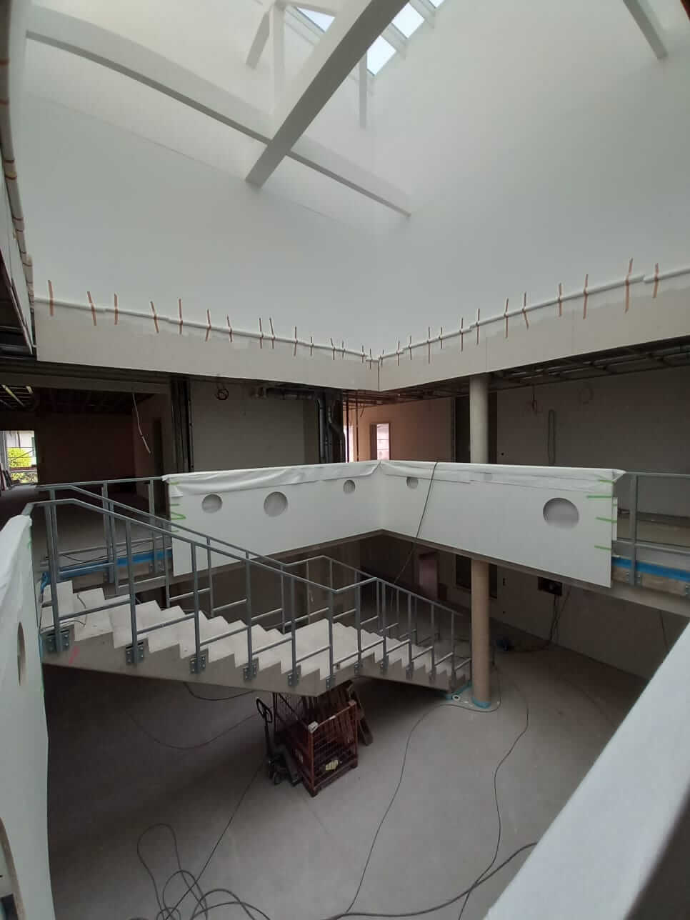 Nach Installation der Fenster ist die Gebäudehülle jetzt geschlossen, so dass der Innenausbau starten konnte. Derzeit arbeiten parallel verschiedene Firmen zum Beispiel aus den Bereichen Elektro, Sanitär, Innenputz und Trockenbau mit teilweise mehr als 30 Personen auf der Baustelle. Inzwischen wurde auch das neue Dachfenster in die Dachfläche eingesetzt. Zukünftig wird über dieses Dachfenster Tageslicht in das ganze Gebäude scheinen, bis ins Atrium der Kita.