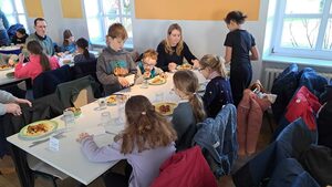 Am Samstag stand schon vor dem Frühstück eine Einheit "Frühsport" auf der Tagesordnung, die auch die letzte Müdigkeit vertrieb (das ein oder andere Kind war bereits um 5 Uhr wach...). Nach dem Frühstück standen drei Workshops an: eine Einheit zur biblischen Mottogeschichte "Kommt her und esst", das Kennenlernen der Messdiener und das Chaosspiel. Nach dem Mittagessen war dann in der Pause ausreichend Zeit das schöne Wetter auf dem Fußballplatz auszunutzen oder auf den Zimmern zu entspannen. Nachmittags durfte jedes Kind aus einer Fülle an Workshops wählen. U.a. gab es Kreativ-Workshops (Taschen, Teller oder Steine bemalen), die Kinder konnten einen Stop-Motion-Film erstellen, Activity spielen oder im Wald spazieren gehen. Nach dem Abendessen gab es noch eine weitere Spieleeinheit. Anschließend machten wir noch einen Nachtspaziergang und ließen den Tag im Torbogen Revue passieren. Nach diesem anstrengenden und langen Tag dauerte es nicht lange, bis Ruhe auf den Zimmer einkehrte...