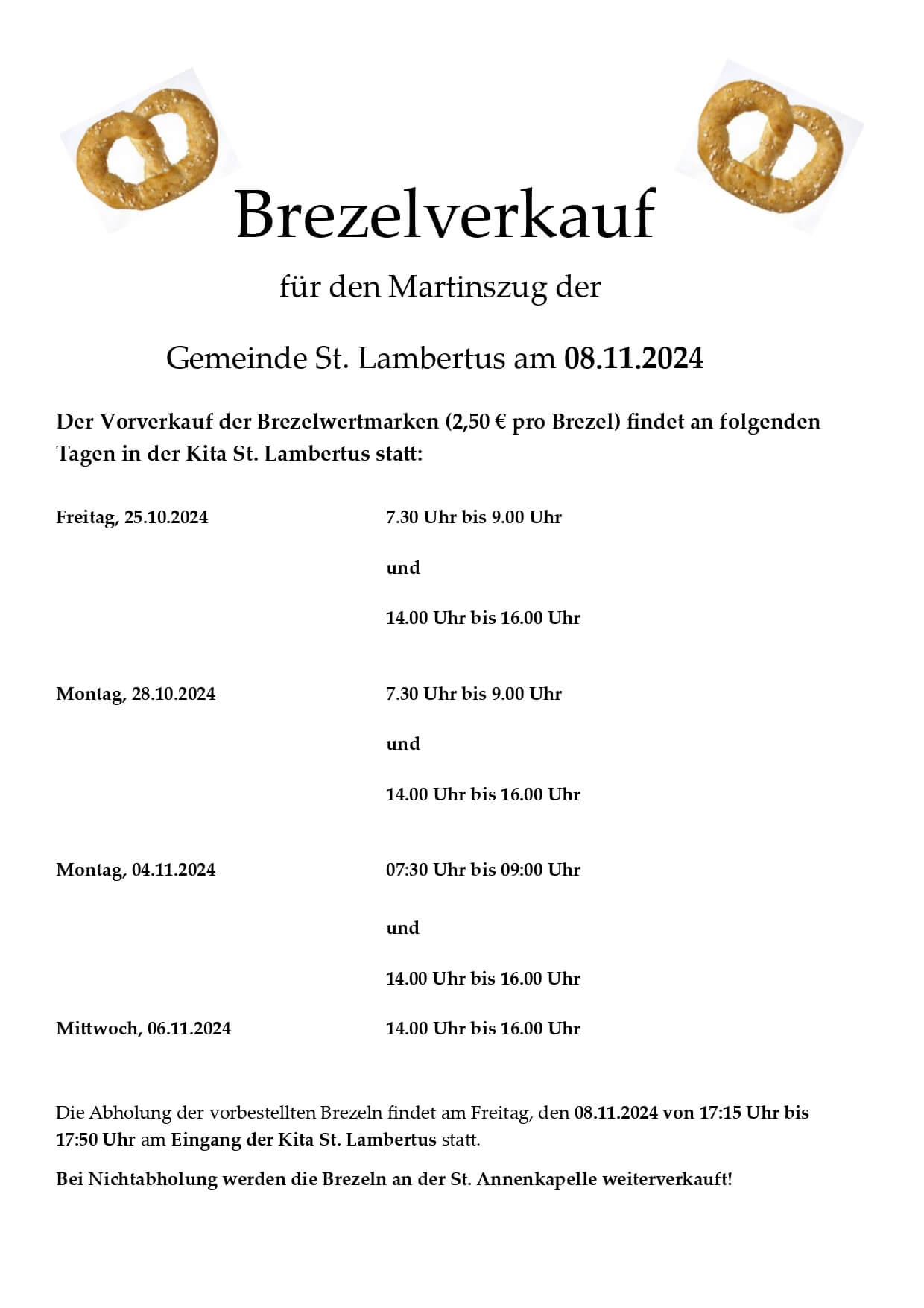 Die Kita St. Lambertus bietet auch in diesem Jahr wieder Martinsbrezel zum Verkauf an. Brezelmarken können im Vorfeld zu folgenden Zeiten erworben werden (s.u.). Darüber hinaus gibt es auch nach der Familienmesse am 03.11. die Möglichkeit Brezelmarken vor der Kirche zu kaufen.