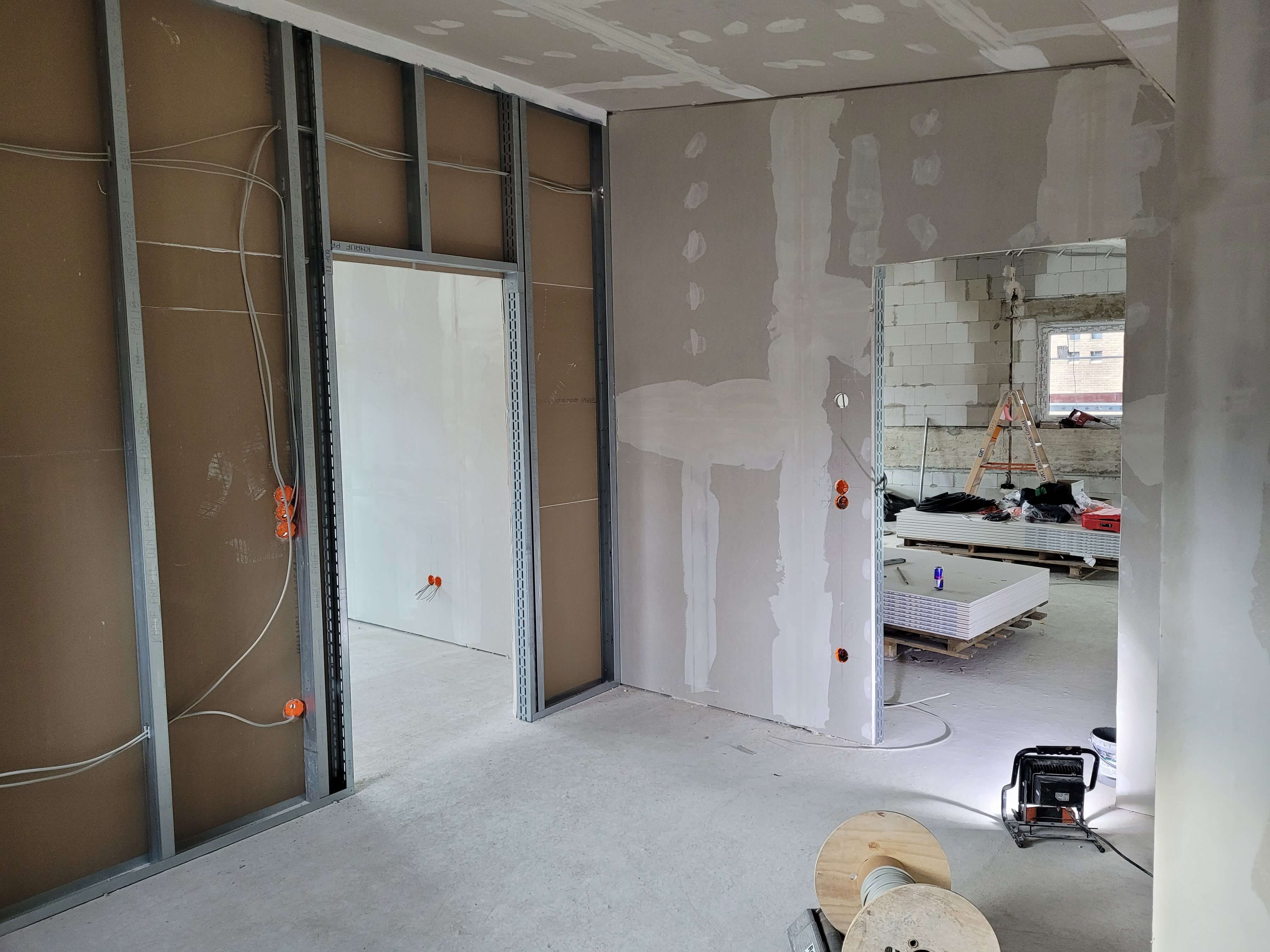 Der Innenausbau schreitet weiter voran. Inzwischen ist die Wärmepumpen-Heizungsanlage installiert, der Trockenbau ist im Feinschliffmodus und die Fliesenlegerarbeiten starten.