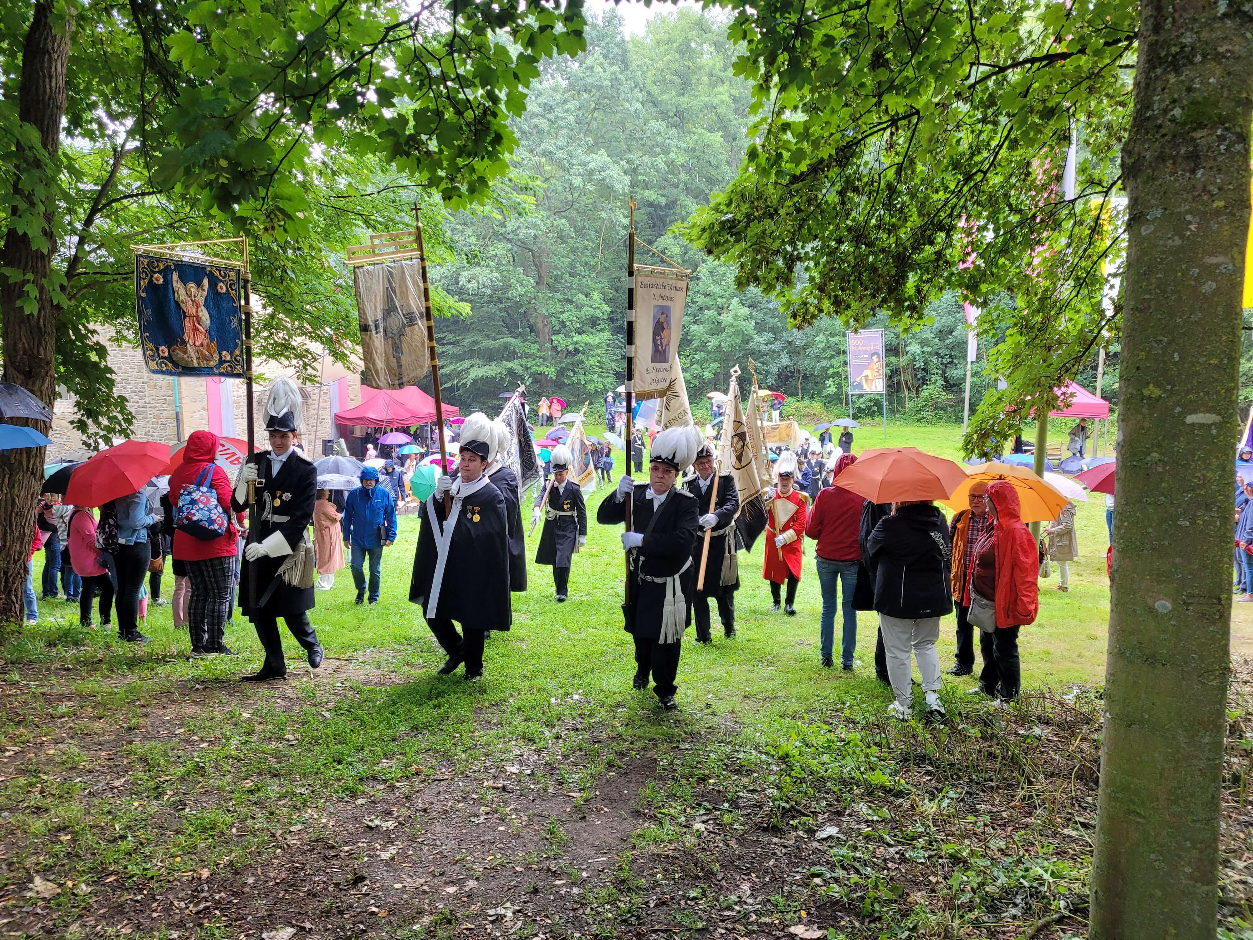 Trotz des Dauerregens versammelten sich am 23. Juli wieder viele Mitglieder der Gemeinde, der Pfadfinder, der eucharistischen Ehrengarden und Bannerabordnungen einiger Kolpingsfamilien zum Festgottesdienst an der Annenkapelle und zur anschließenden Prozession zur Stiftskirche. Dank des morgens von den Pfadfindern noch aufgebauten Zeltes bot sich für alle hinterher noch die Möglichkeit zum Mittagessen und zum Kaffeetrinken im und am Brauhaus zu verweilen.