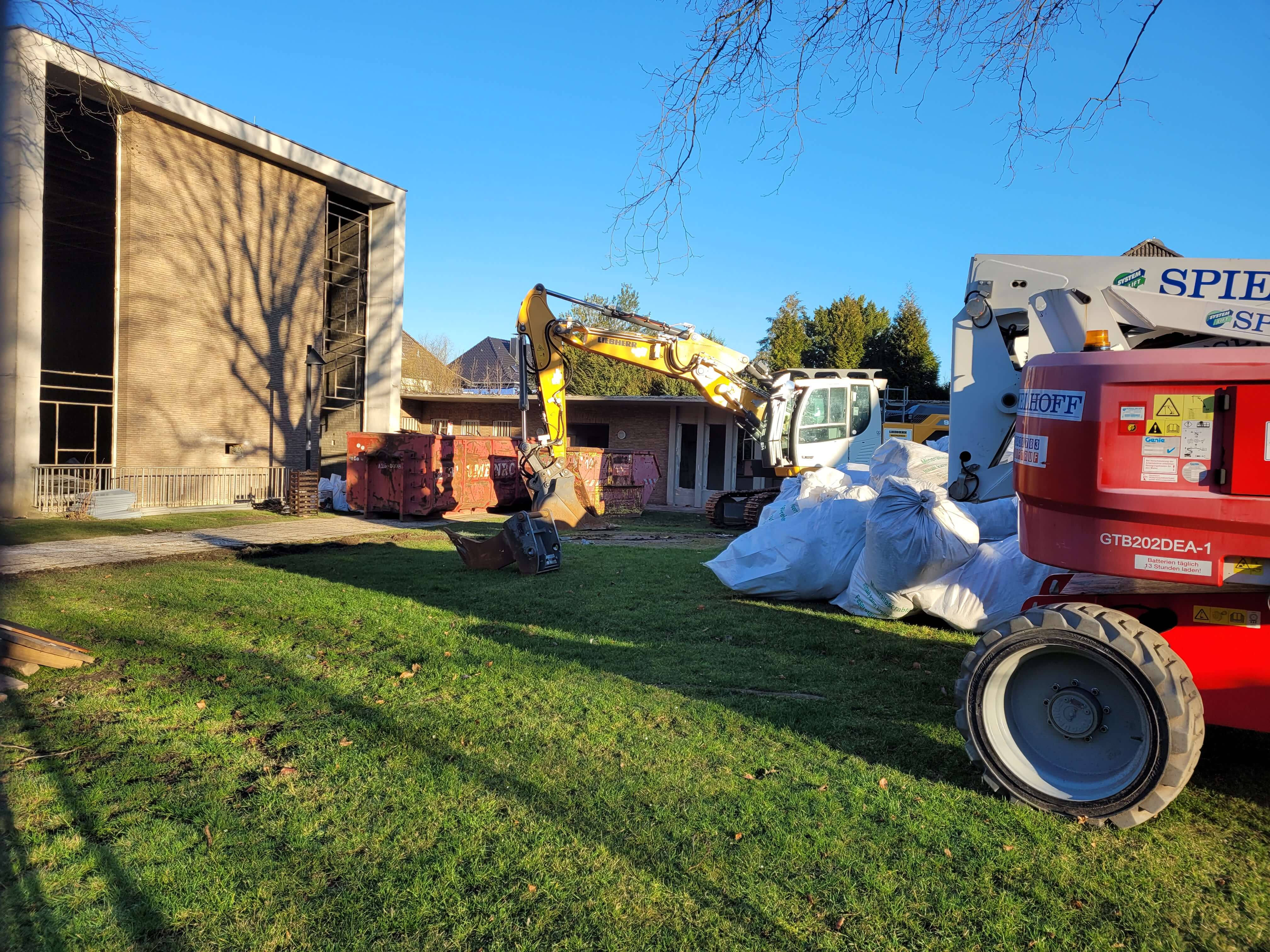 Die Abbrucharbeiten im Rahmen des Umbaus schreiten voran und haben das bisherige Kirchengebäude erreicht. In einem ersten Schritt werden die Stirnseiten abgerissen. Im nächsten Schritt werden dann die beschädigten Klinker und das Mauerwerk zwischen den Betonstützen und -streben entfernt.