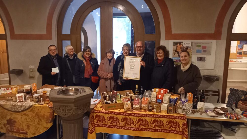Am Sonntag, den 19.01.2024, überreichte Frau Meilwes vom Bistum Essen (Abteilung Weltkirche und Mission, 2.v.r) in der Messe um 11:15 Uhr das Zertifikat „ökologisch und fair im Bistum Essen“.