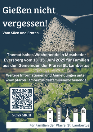 Herzliche Einladung zum Familienwochenende! Unter dem Motto "Gießen nicht vergessen! Vom Säen und Ernten..." findet vom 13. - 15. Juni das diesjährige Wochenende für Familien der Pfarrei St. Lambertus statt. Der Anmeldezeitraum läuft vom 03. - 23. …