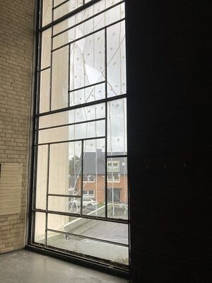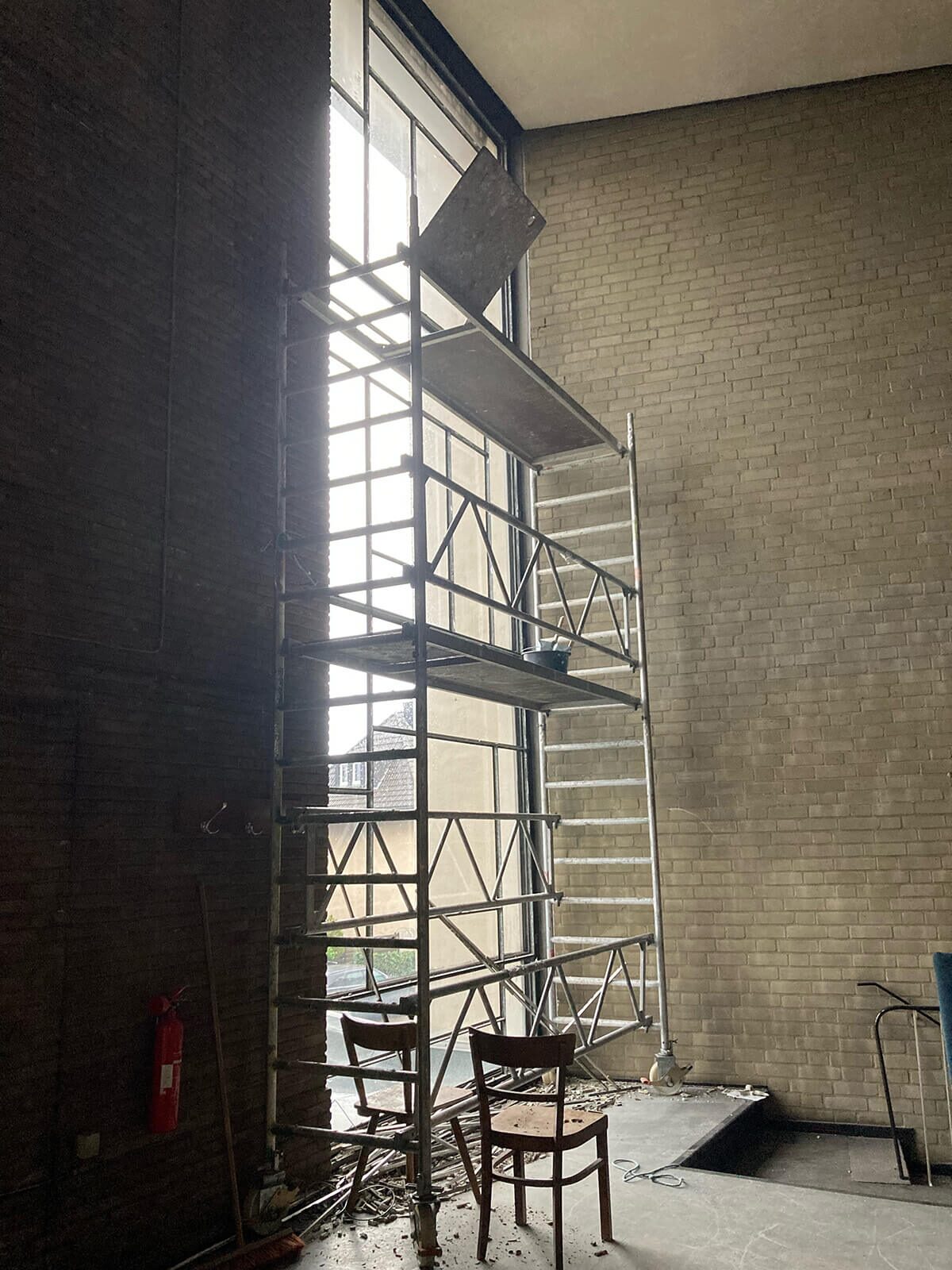 Zuerst werden die Fenster an der Vorderseite (Westseite) entfernt. Die Fenster an der Altarseite, die ja bis auf den Boden reichen, folgen in terminlicher Abstimmung mit den nachfolgenden Abbrucharbeiten, um nicht über einen unbestimmten Zeitraum hinweg offene Wände zu haben.