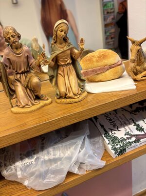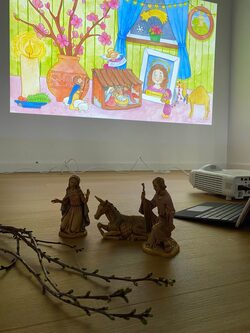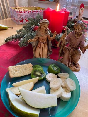 Die Weiterreise im Kinderwagen und mit dem Fahrrad war etwas holprig. Auf dem Weg zur Unterkunft bei der neuen Gastfamilie sind wir noch bei deren Großeltern eingekehrt und haben uns bei Plätzchen, Kerzenschein und Weihnachtsliedern gestärkt. Nach einem verspäteten Mittagsschlaf und leckerem Abendessen ging es dann weiter. In der neuen Herberge haben wir ein warmes Bett neben einem leuchtenden Stern auf der Fensterbank bekommen und durften einer Adventskalendergeschichte von "Schnüpperle" und seiner Schwester Annerose als gute Nacht Geschichte lauschen. Wir haben sehr gut geschlafen, auch wenn Josef ein bisschen geschnarcht hat. Heute morgen wurde Maria noch ärztlich untersucht, weil ihr der Rücken vom großen Babybauch ein bisschen weh tat. Dem Baby geht es zum Glück sehr gut und es wird wahrscheinlich in knapp zwei Wochen - um Weihnachten herum - zur Welt kommen, hat die Ärztin vermutet. Nach einem gemeinsamen Frühstück mit Müsli und Kaffee sind wir dann (mit ein bisschen Wegproviant - etwas von den leckeren Plätzchen von gestern) weitergezogen und schon sehr gespannt, was uns heute erwartet.