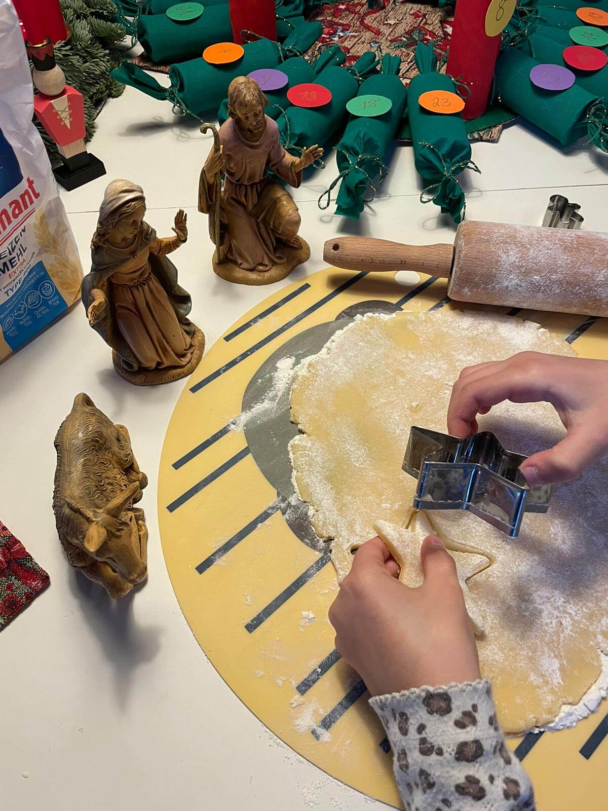 Dann wurde es spannend, wir haben ein Lebkuchenhaus aufgebaut und verziert. Das Dach war leider undicht, aber zum Glück ist Josef ja Zimmermann und hatte eine gute Idee woraufhin das Dach komplett gedeckt war. Ich dachte erst das könnte unsere nächste Herberge werden, aber wie auf dem Foto zu sehen war es doch etwas klein. Am Ende wurden noch die Stiefel geputzt, denn heute Nacht wird der Nikolaus erwartet. Dann gab es noch eine kurze Weihnachtsgeschichte und nach so viel Aufregung ging es nach dem Abendbrot schnell ins Bett. Wir sind gespannt und freuen uns auf den nächsten Tag!