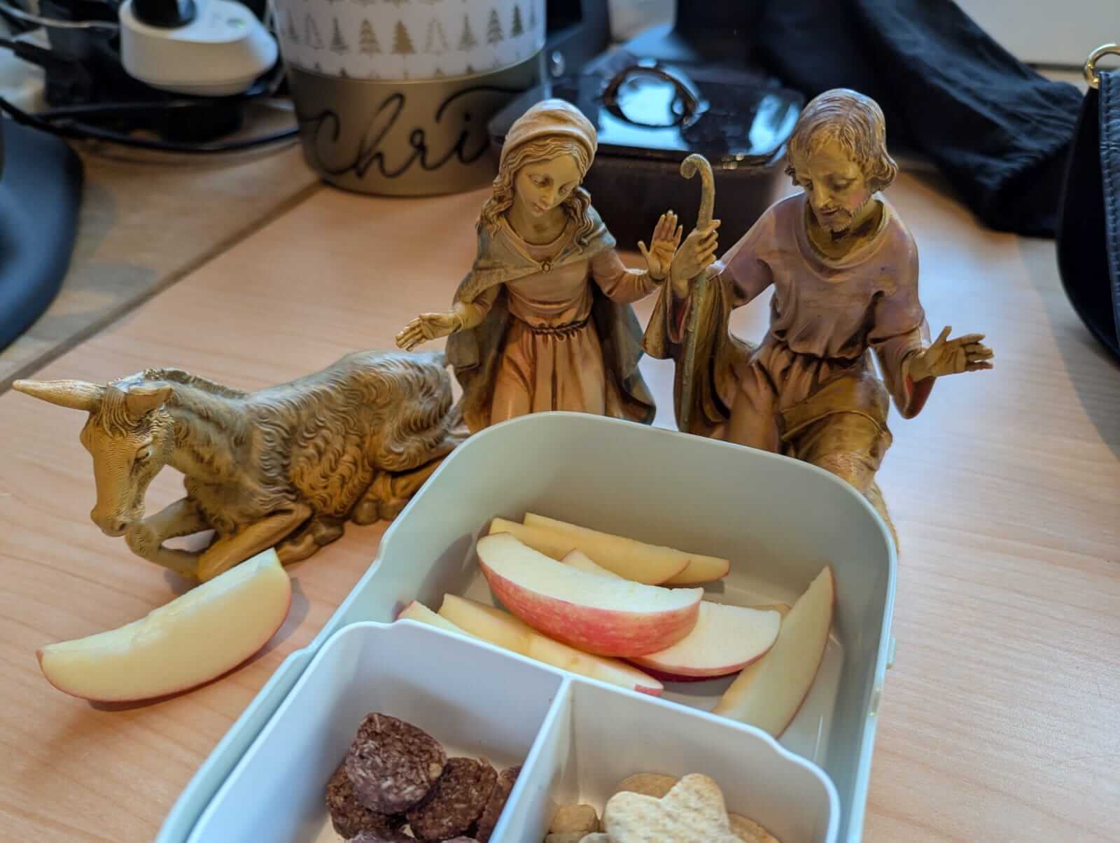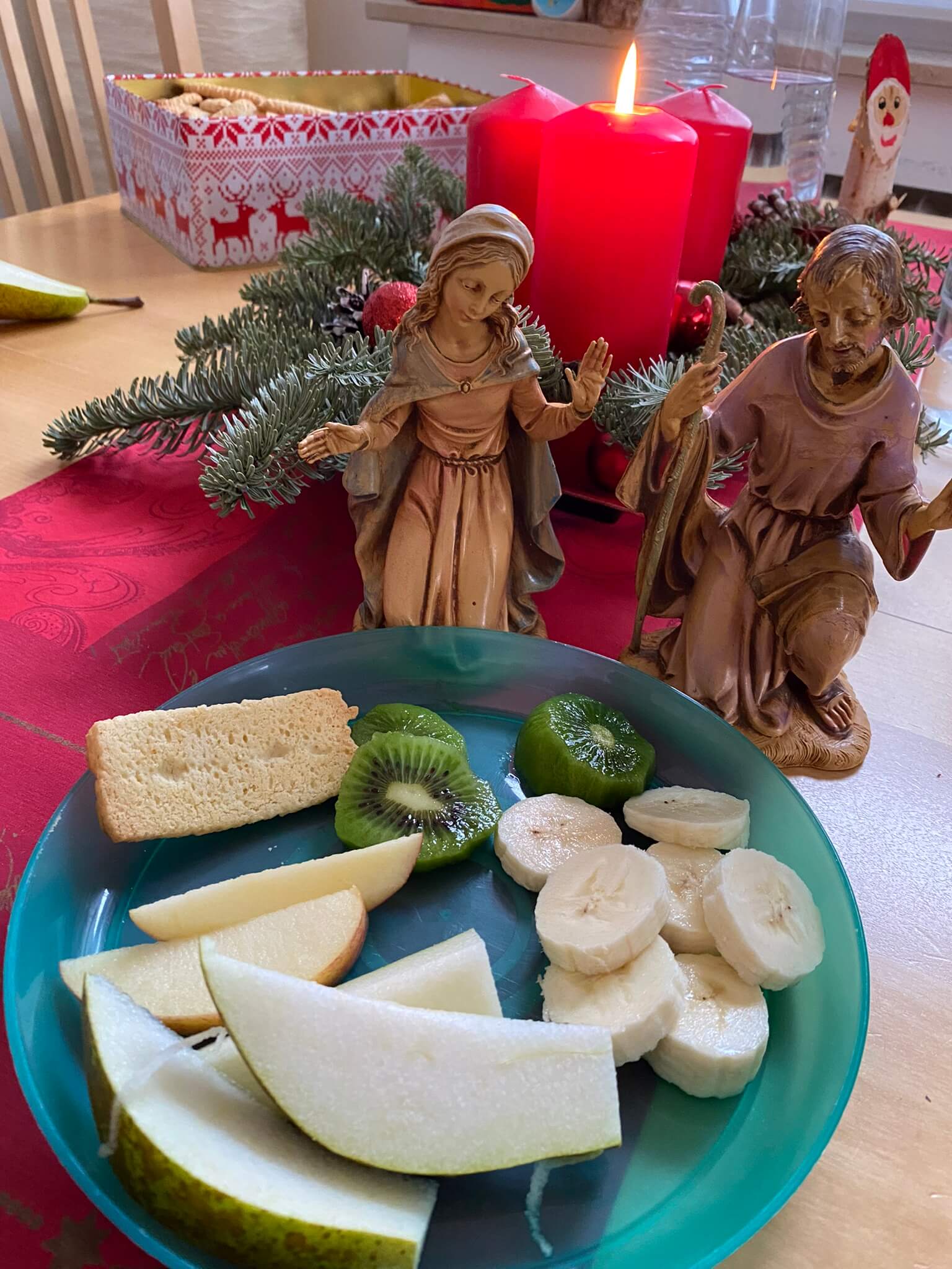 Anschließend haben wir uns bei unserer Herbergsfamilie etwas ausgeruht. Als beide Kinder wieder aus der Kita zurück waren, haben wir uns ein wenig gestärkt. Während Maria und Josef gesundes Obst gegessen haben (für das ungeborene Baby bestimmt auch besser), probierte ich die selbstgebackenen Schokoladenplätzchen. Mhhh, waren die lecker!
