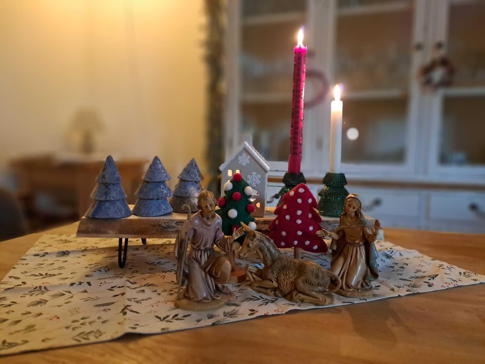 Josef wurde auf eine sogenannte Toniebox gestellt und anscheinend dachte das Kind, er würde singen. Weil ich weiß, wie Josef singt, bin ich schnell geflüchtet, aber er hat wohl den Blick von Maria gesehen und hat uns zum Glück verschont. Nicht, dass vor lauter Schreck das Kind zu früh geboren wird. Bei meiner Flucht bin ich auf einem Berg gelandet, der sich dann aber als ziemlich entspannter Typ namens Buddha entpuppte. Der hat da aber nur gesessen und nichts gemacht, das war mir dann schnell zu öde. Wir haben dann alle zusammen doch noch gesungen und so im Chor klang Josef ganz ok. In den Liedern kamen sogar zwei Menschen vor, die auch Maria und Josef heißen, das fand ich echt lustig.